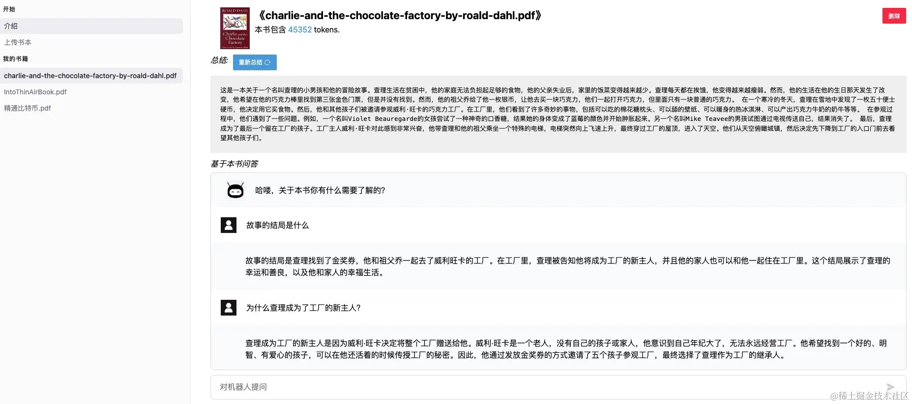 利用OpenAI的能力,实现了文档内容概要生成和基于文档内容进行问答的功能。文件支持pdf和epub两种文件格式,支持概要和对话的本地持久化。网站免费使用,无需注册或登录。进入网站>> 代码仓库地址>>