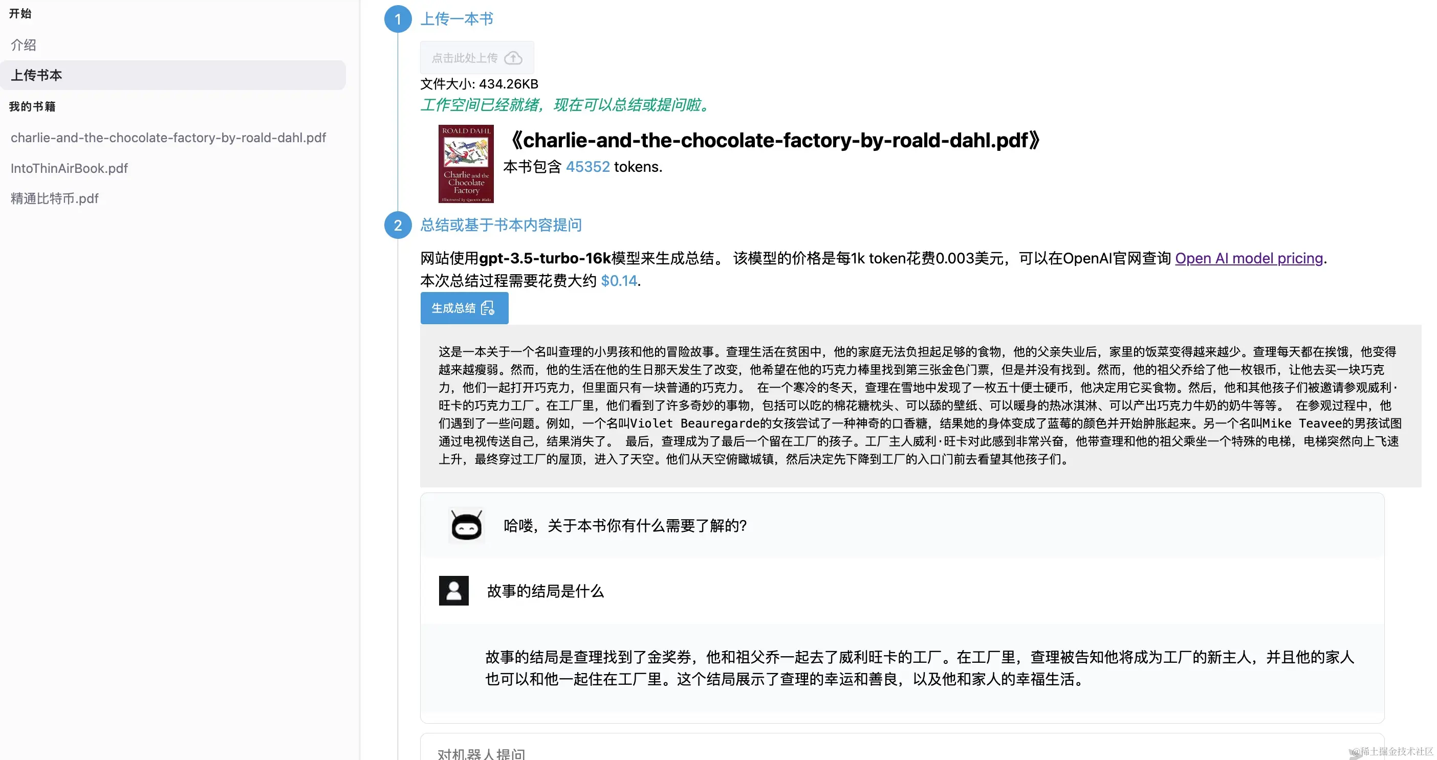 .pdf或.epub格式的文件 如果您没有文件,您可以点击下载一个示例pdf文件。上传完成后,服务端会帮您处理剩下的事,您只需要耐心等待。 如果您不是开发人员,可以跳过剩下的步骤。 - 服务端会从上传的文件中提取所有的文本内容,然后调用合适的