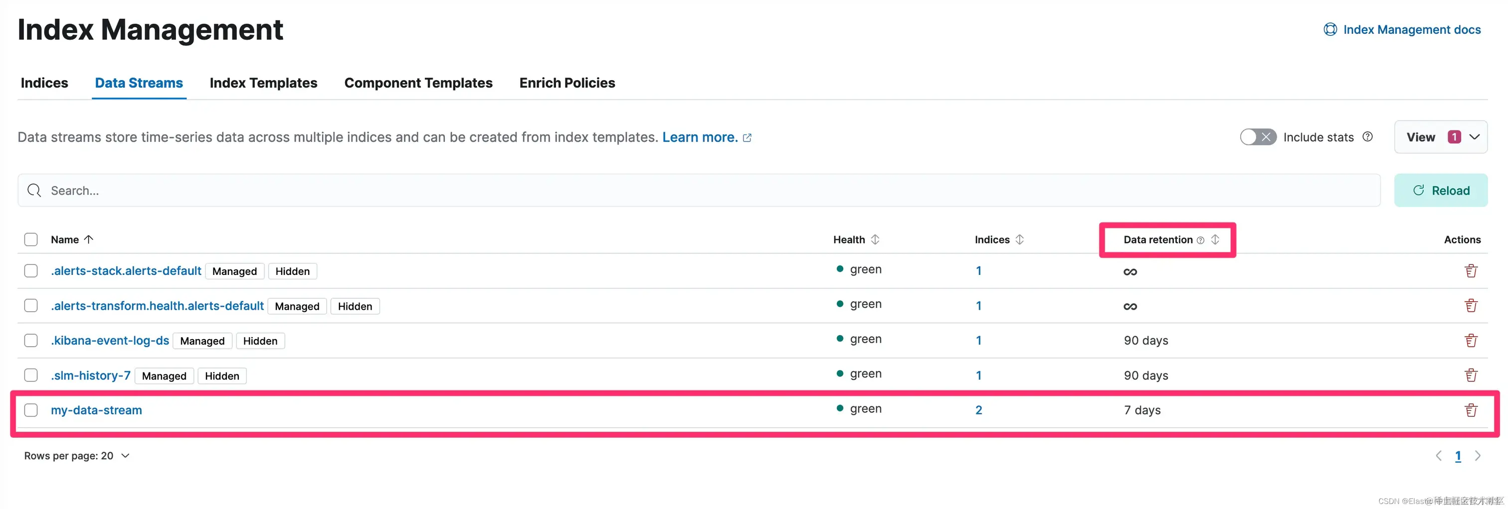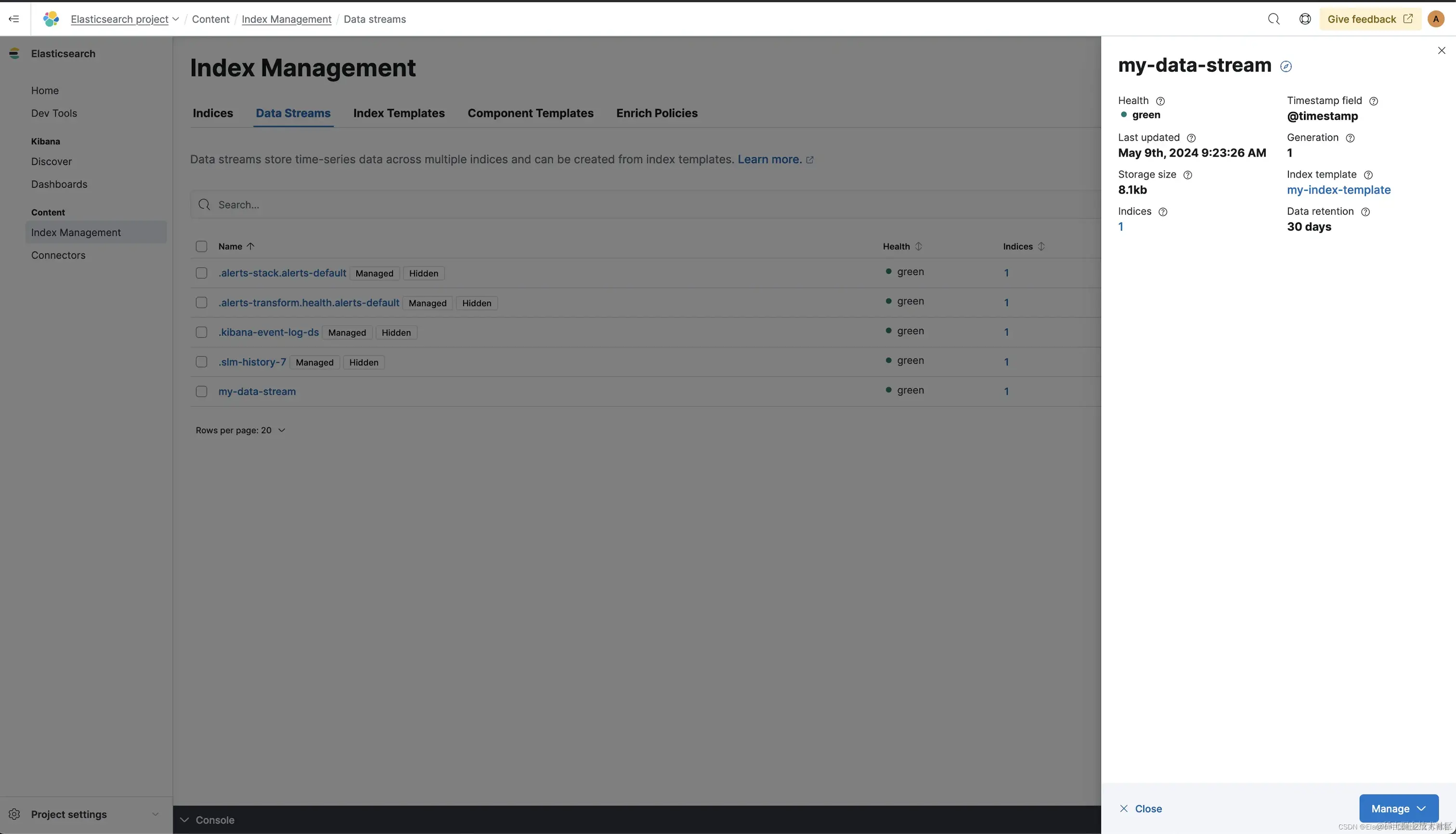就这样!🎉 我们的数据流由数据流生命周期管理,数据保留期配置为 30 天。所有与 my-data-* 模式匹配的新数据流都将由数据流管理,并获得 30 天的数据保留期。