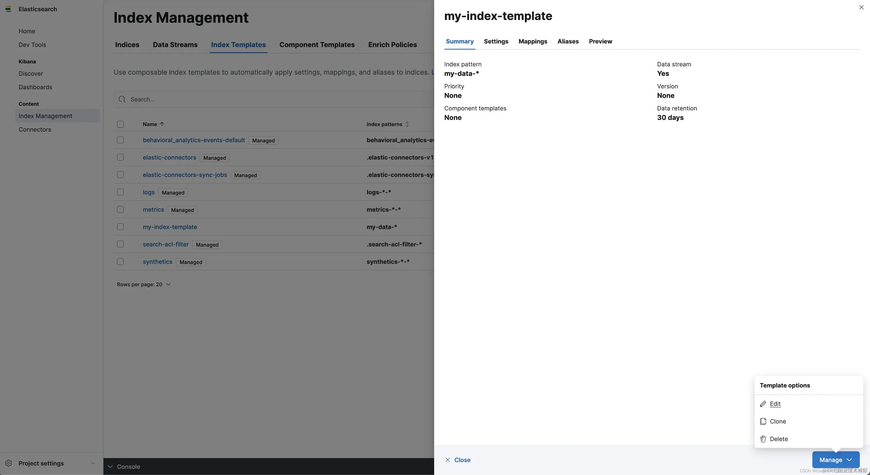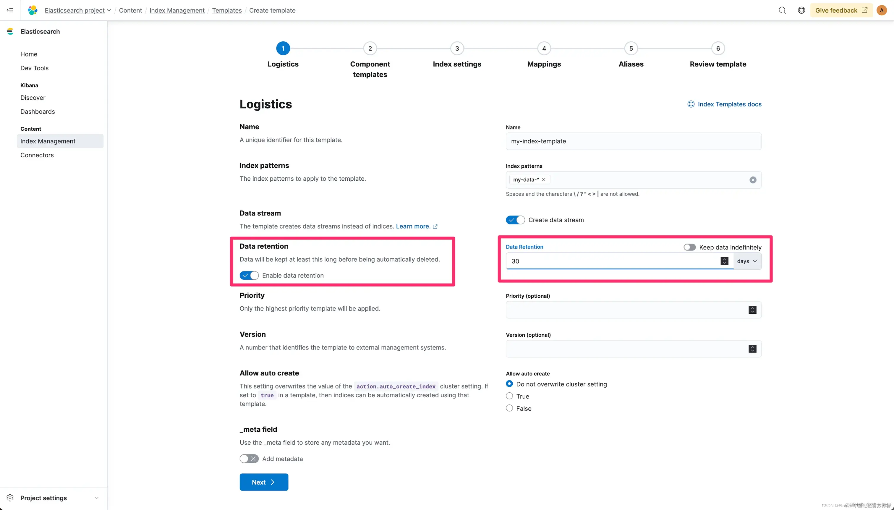 创建项目后,转到索引管理并为 my-data-* 索引模式创建索引模板并配置 30 天的保留期:
