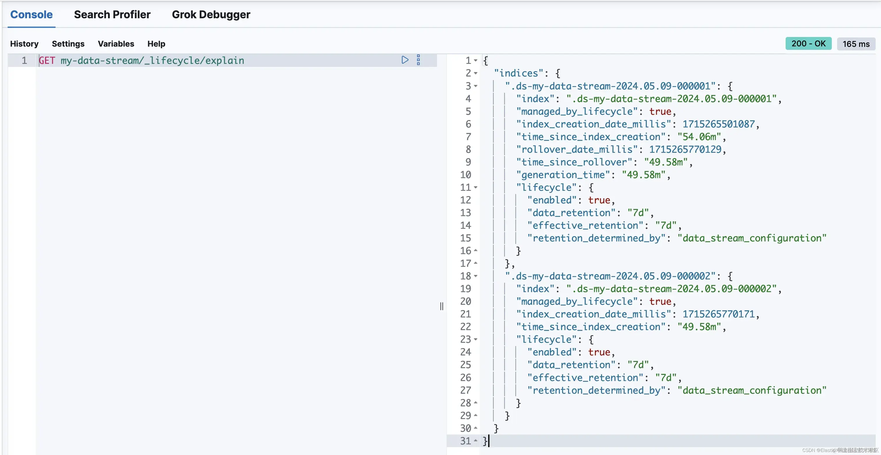 较旧的索引 .ds-my-data-stream-2024.05.09-000001 不再是数据流的写入索引,我们可以看到解释 API 将 generation_time 报告为 49 分钟。一旦生成时间达到 7 天,.ds-my-data-stream-2024.05.09-000001 后备索引将被删除以符合配置的数据保留期。