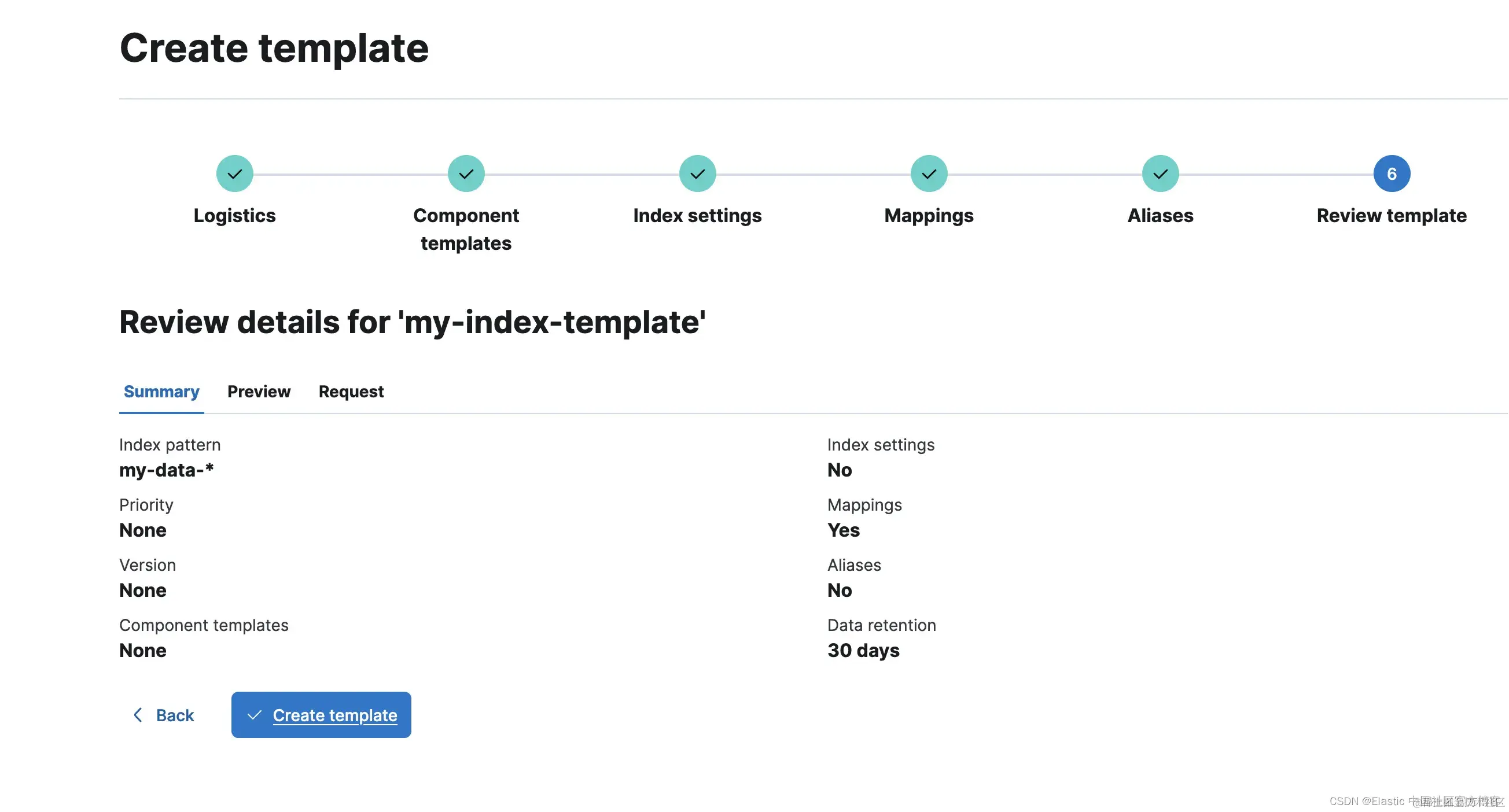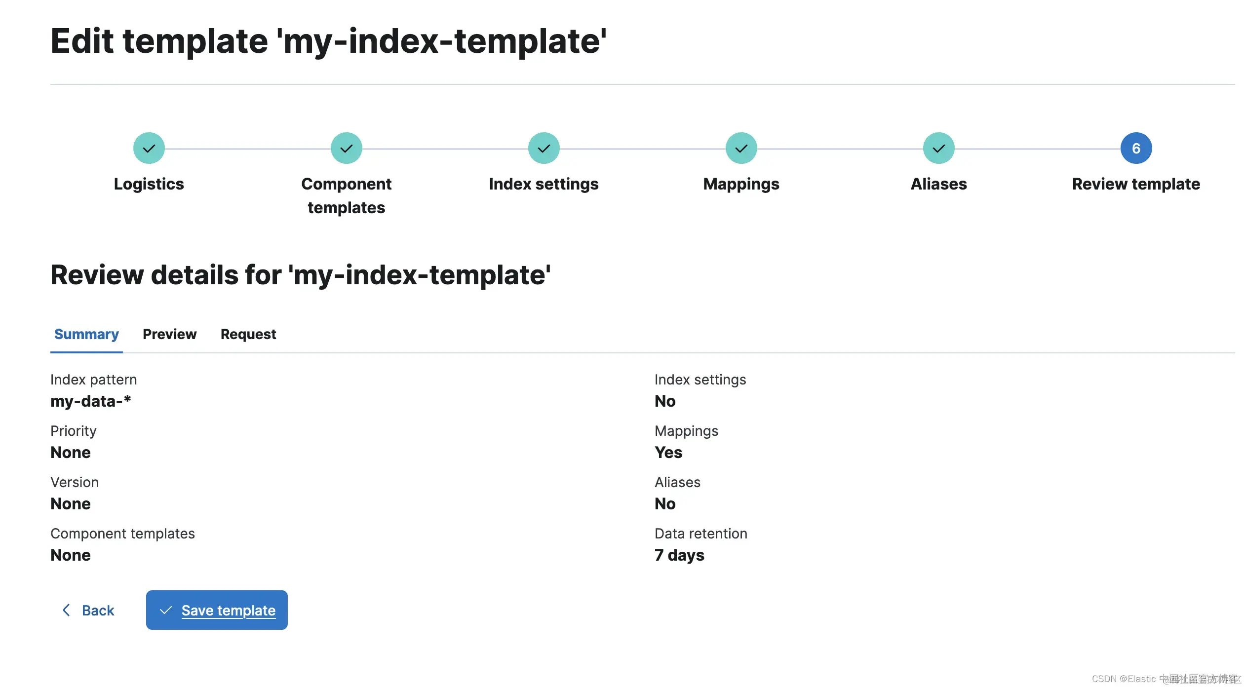让我们浏览这些步骤并完成此索引模板(我在映射部分配置了一个文本字段,但这是可选的):