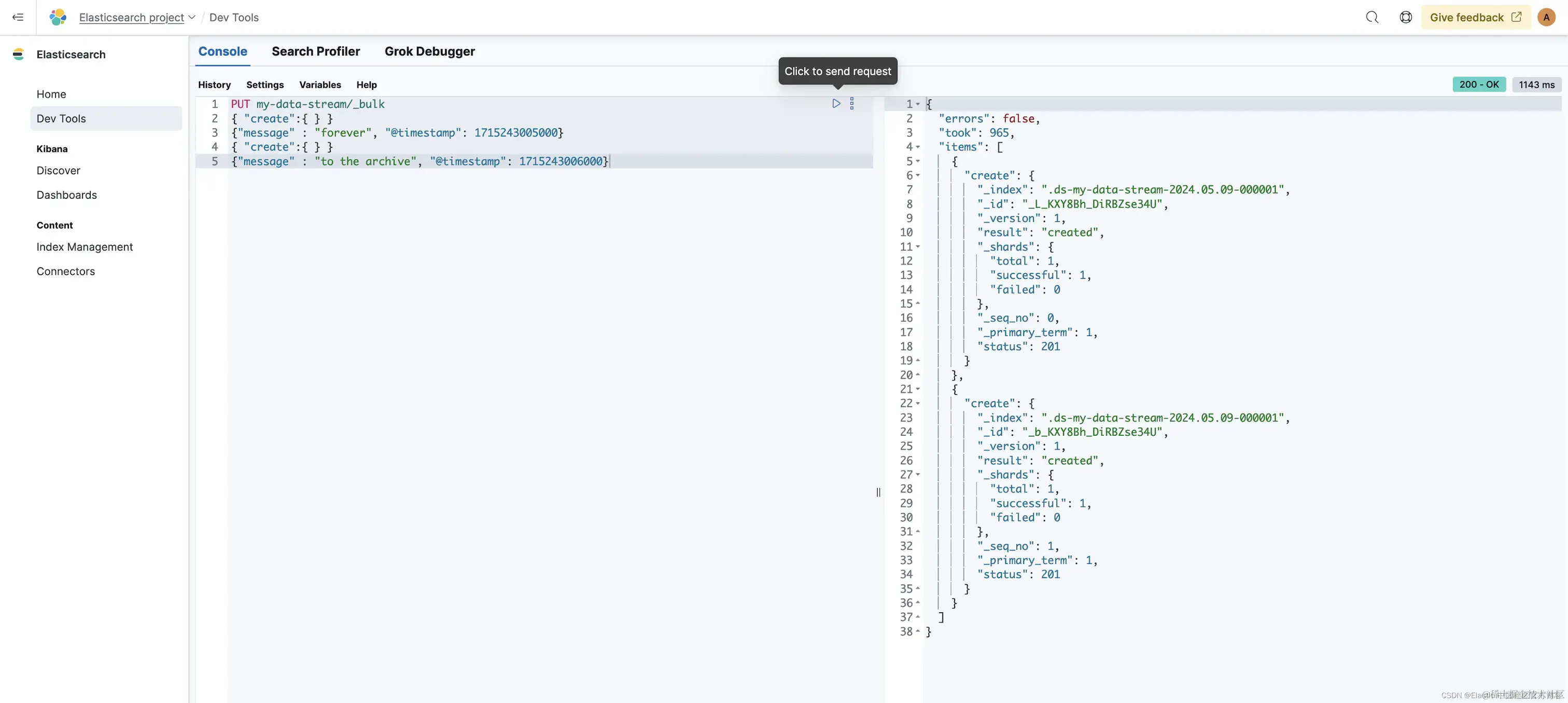 现在,我们将提取一些以 my-data-stream 命名空间为目标的数据。我将使用左侧的 Dev Tools 部分,但你也可以选择自己喜欢的数据提取方式: