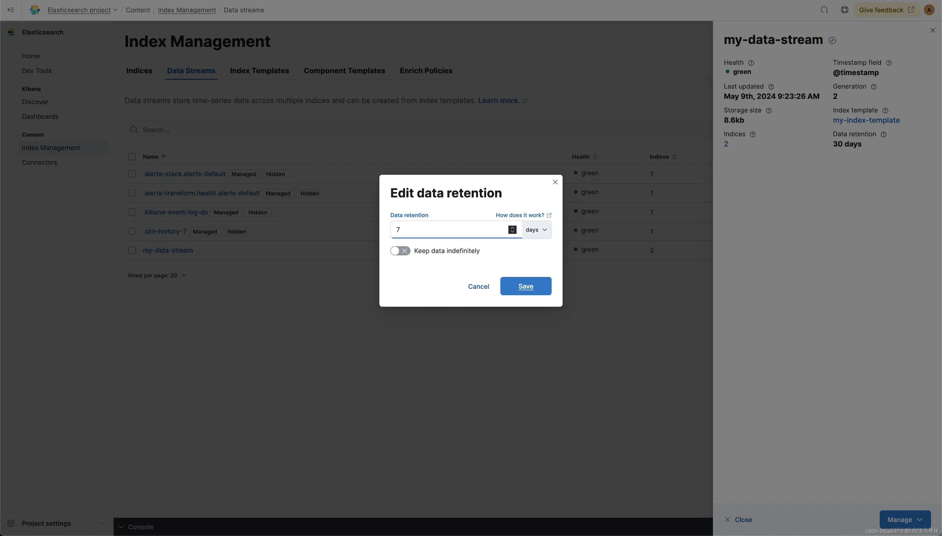 数据流生命周期属性属于数据流。因此,我们可以通过直接导航到数据流来配置更新现有数据流的生命周期。让我们转到索引管理/数据流并将 my-data-stream 的保留期编辑为 7 天: