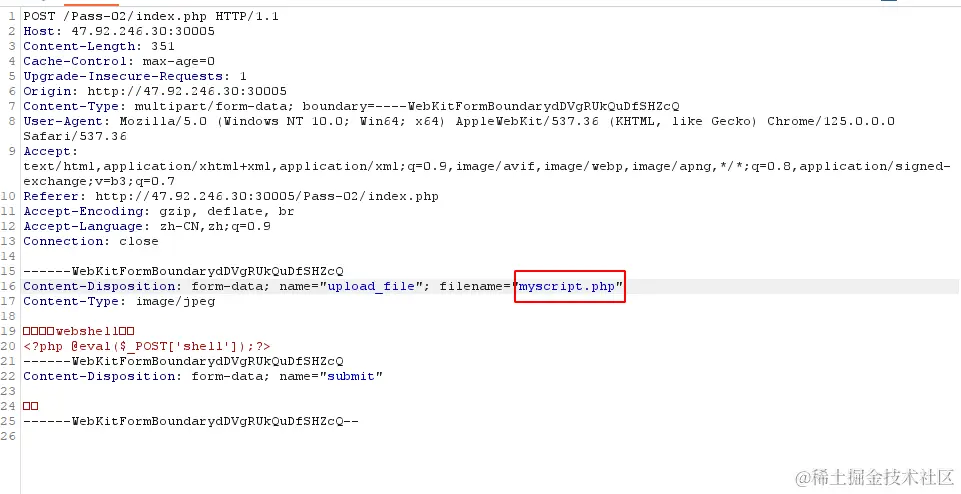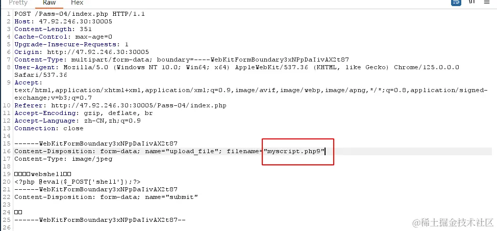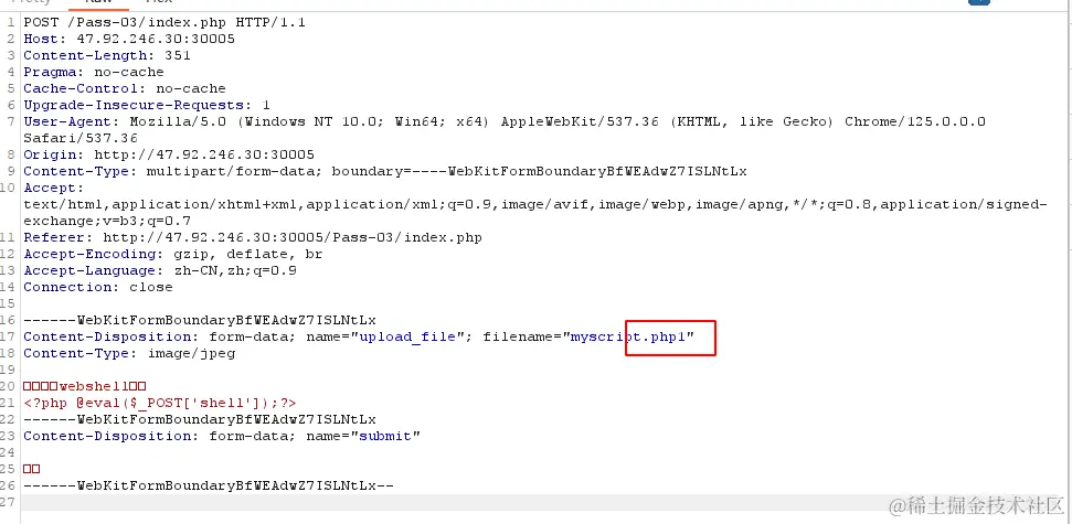 使用burp suite劫持包在文件后缀添加一个空格,上payload,filename="myscript.php "