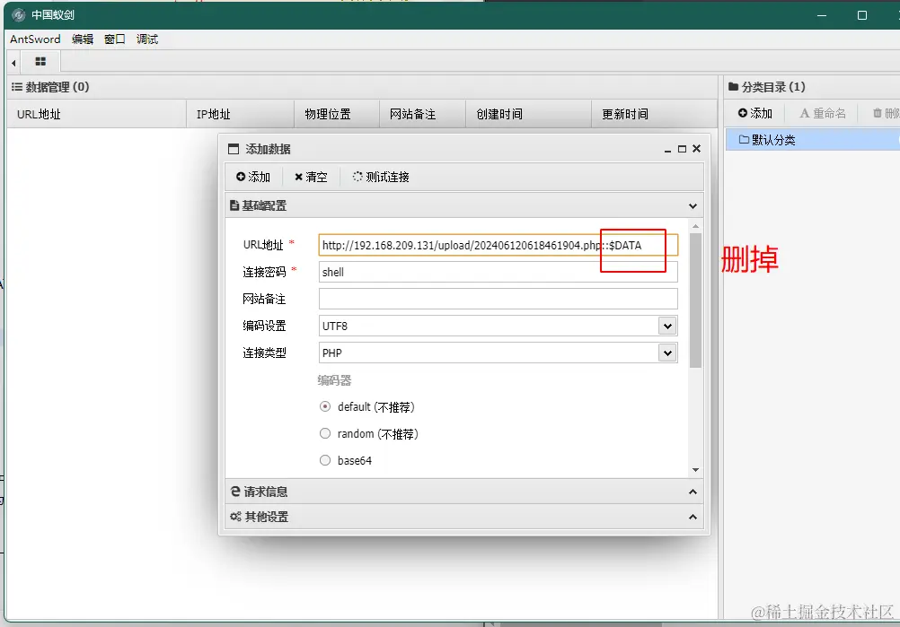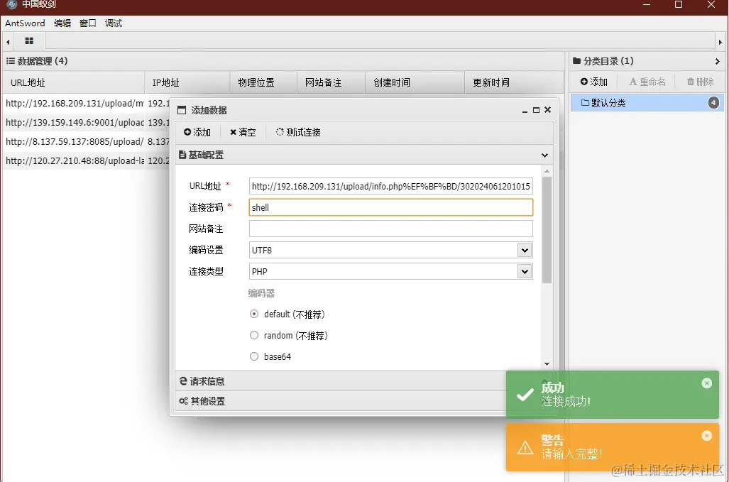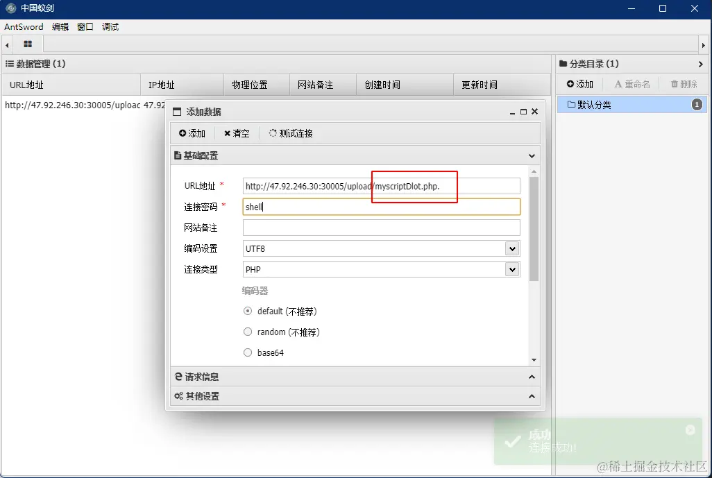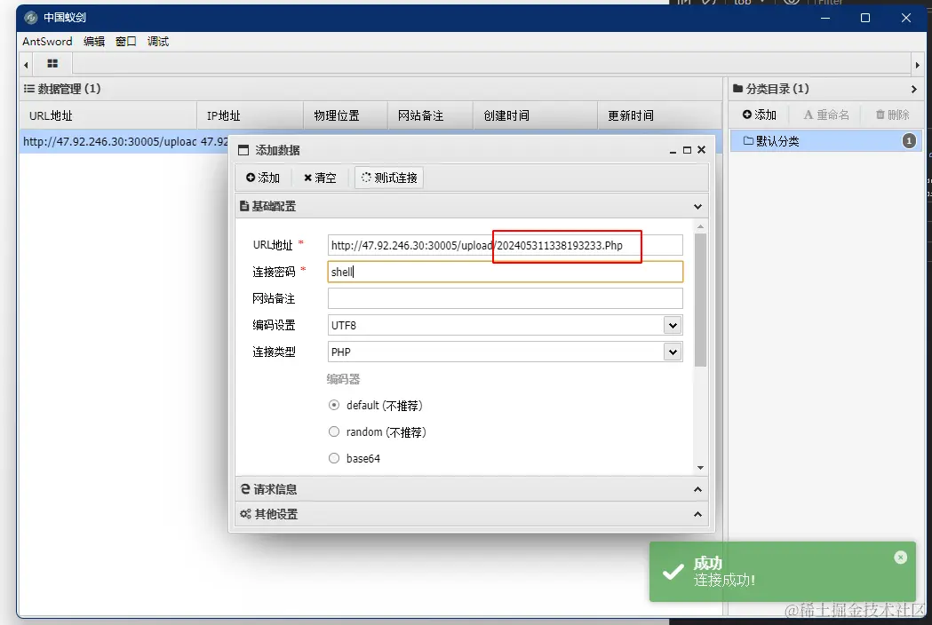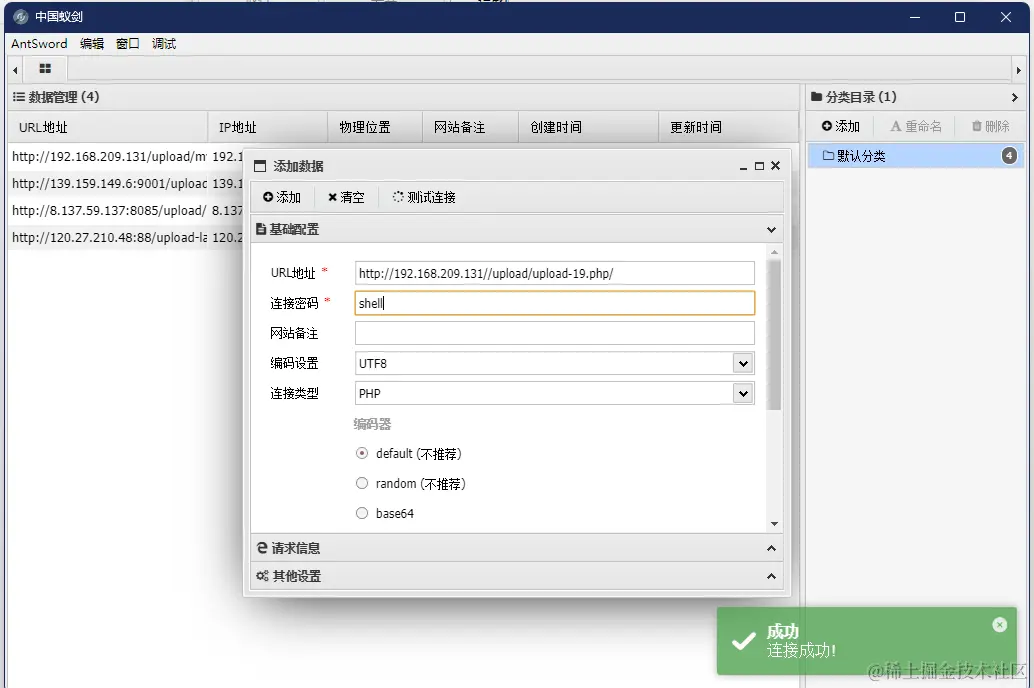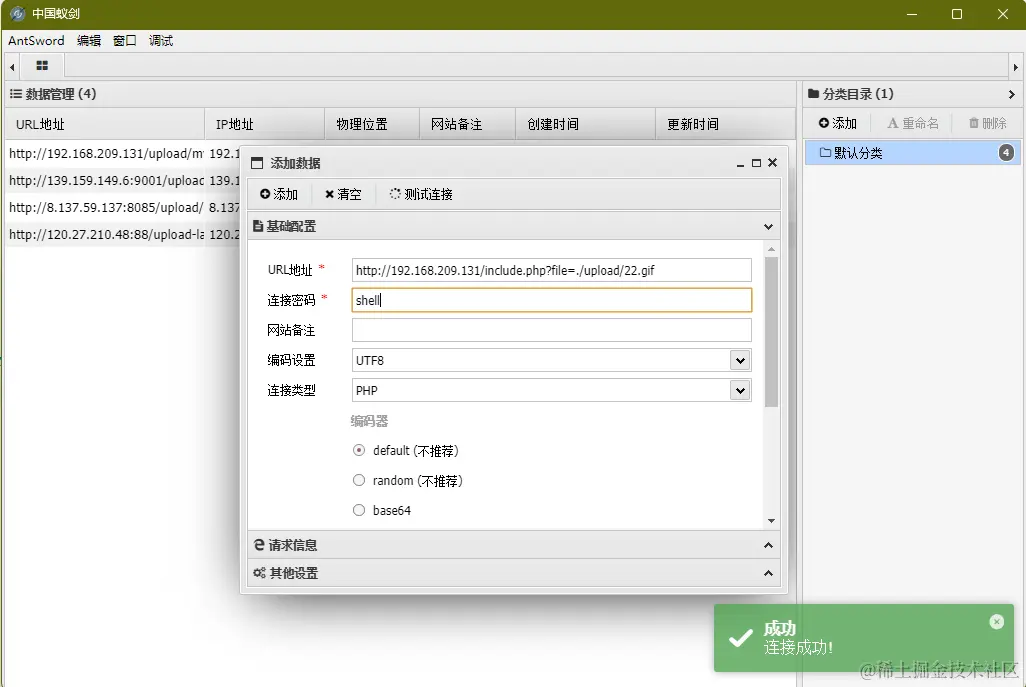 注意蚂蚁连接的文件是注入的一句话木马创建的文件。