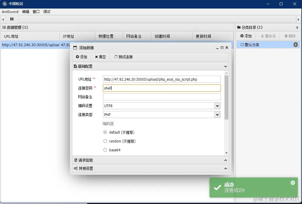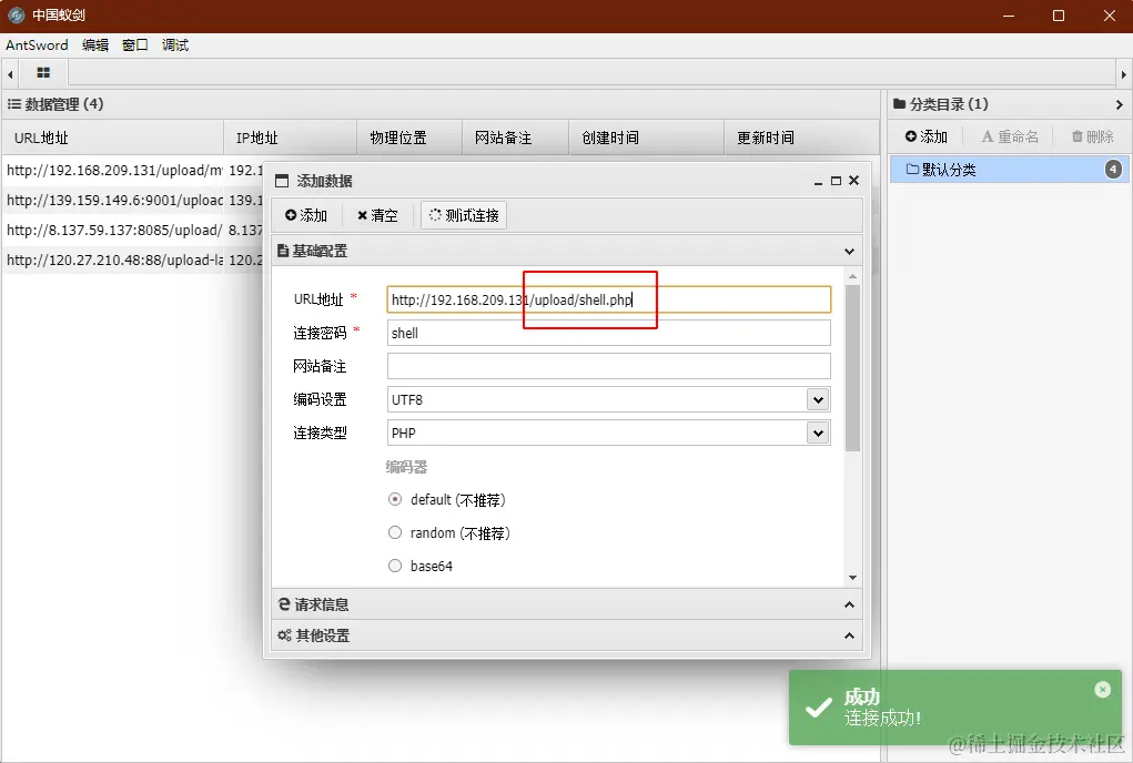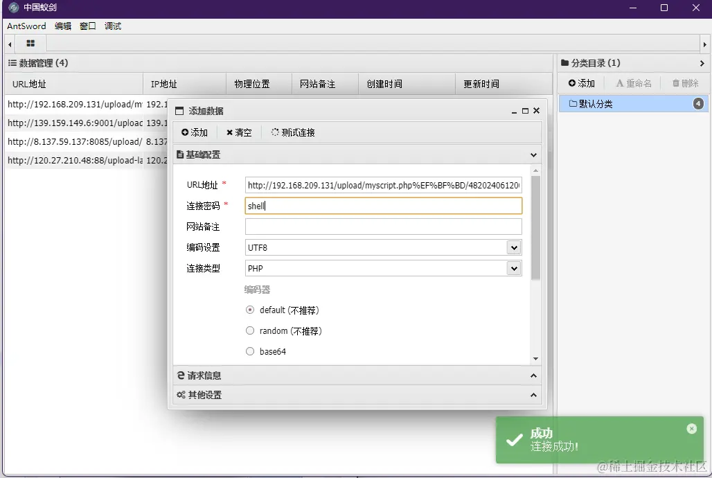 使用中国蚁剑测试,连接密码就是你php post请求的shell参数