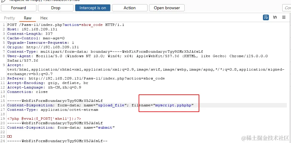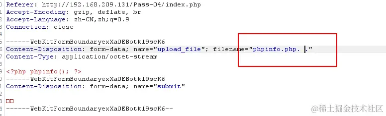 通过源码我们可以发现,他仅仅对文件名称进行了替换,替换之后的后缀没有进行黑名单验证,这里我们就可以使用双写文件后缀进行文件上传,例如filename="info.pphphp"。