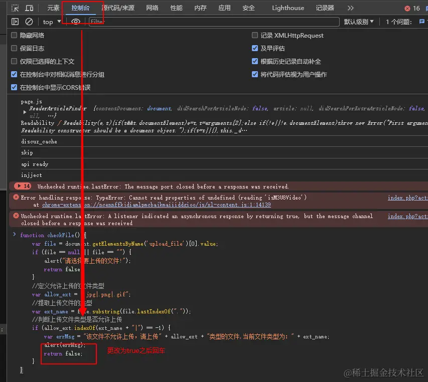 这时候我们把js复制下来,打开浏览器控制台,并回车,直接重置checkFile()这个同名函数,使js执行俩次。