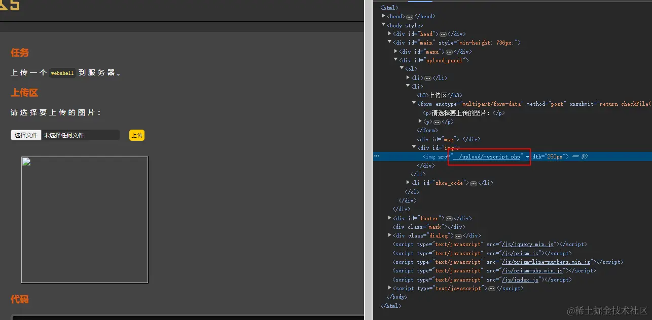 第一关因为是进行前端JS校验,分析源码可以直接在浏览器检查代码把checkFile()函数(即如下图红色框选中的函数)删了或者也可以把红色框改成true,并按回车,即可成功上传php文件。