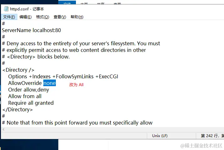 httpd.conf文件更改。 启用.htaccess,需要修改httpd.conf,启用AllowOverride,并可以用AllowOverride限制特定命令的使用。 打开httpd.conf文件用文本编辑器打开后,查找