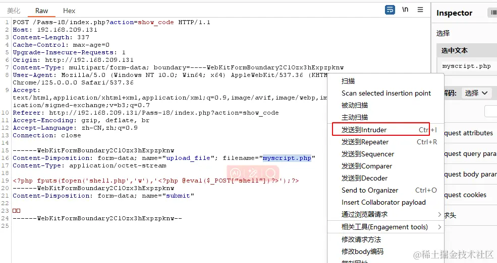 首先,我们上传PHP文件,用BP拦截,并发送到攻击器Intruder