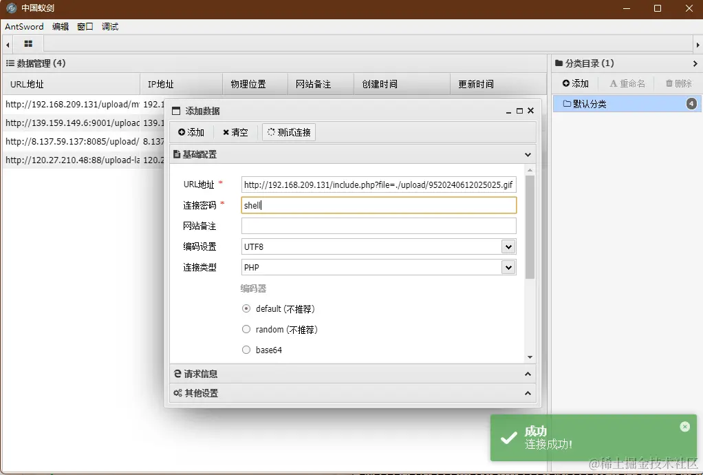 在这一环节,上传的图片经过了后缀名、内容类型和imagecreatefromgif函数的严格验证,确保其为GIF格式。随后,图片经过了二次渲染处理。然而,在后端的二次渲染过程中,需要识别并标记出渲染后未发生改变的十六进制(Hex)区域。通过利用文件包含漏洞,可以在这些未变区域嵌入恶意代码,进而使用蚁剑工具进行远程连接和操作。