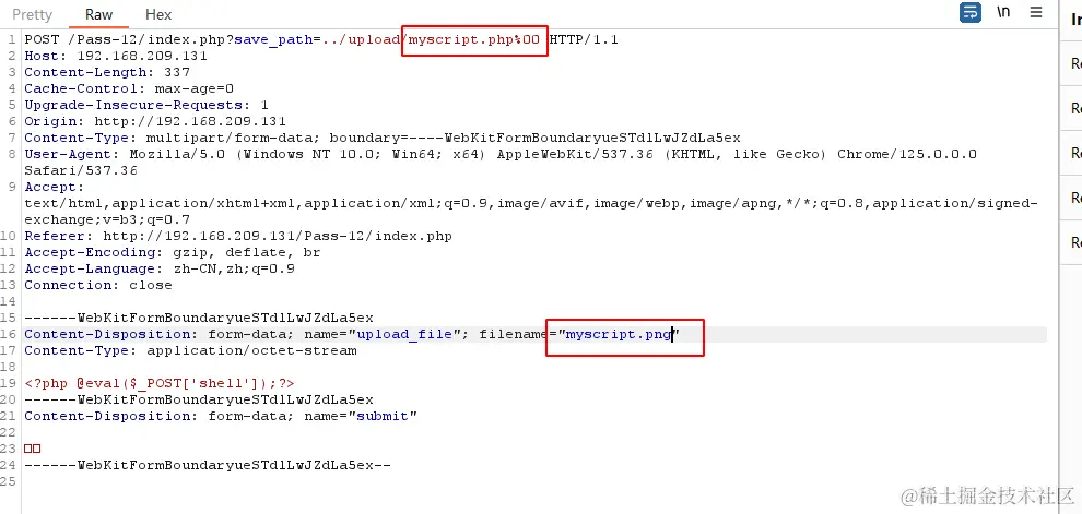 原理简述:PHP函数如move_uploaded_file在底层C语言实现时,会因遇到0x00(URL编码为%00)截断字符串。利用此特性,可绕过某些文件上传限制。