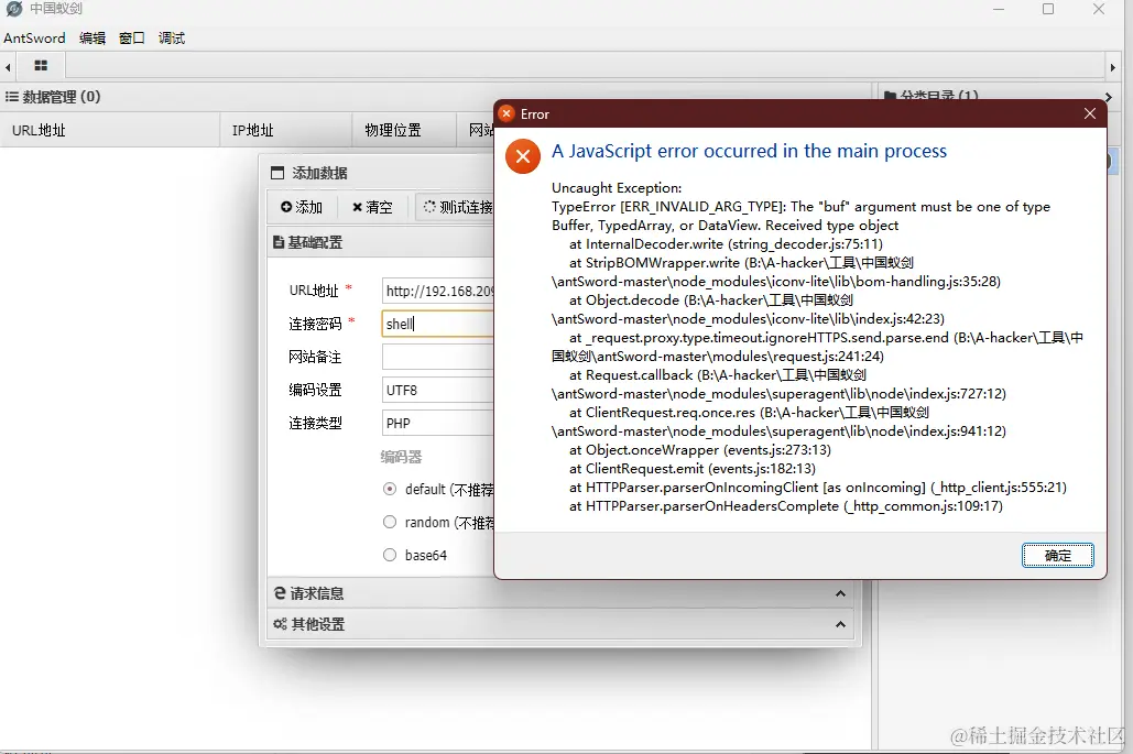 在BP攻击的同时我们也要运行python脚本,目的就是不停地访问myscript.php知道成功访问到为止。当出现OK说明访问到了该文件,那么shell.php应该也创建成功了,用蚁剑连一下试试。