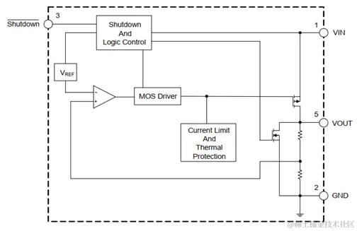 在LDO关闭时,下图中标注的MOS管会自动打开,VOUT通过Rdischg对地放电,有的LDO框图中没有画这个自放电电阻,但是也是带自放电功能的,自放电电阻大小可以通过RC放电公式进行计算。