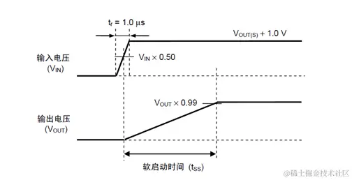 软启动的时间可以依据下图测试,TSS是输入电压上升到0.5倍到VOUT完全起来的时间间隔。
