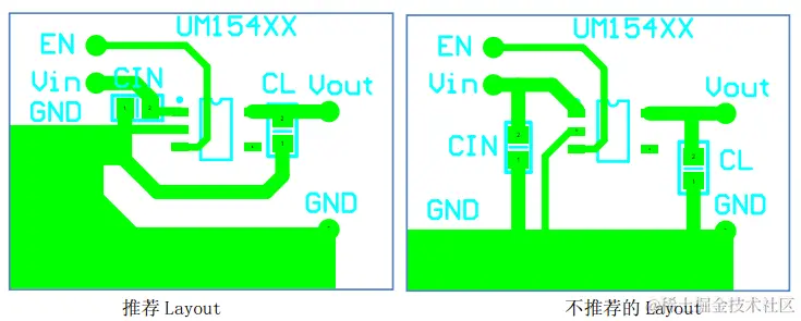 输入输出电容靠近LDO管脚放置,LDO和电容要使用同一铜层铺地,输入输出电容的地环路要短。