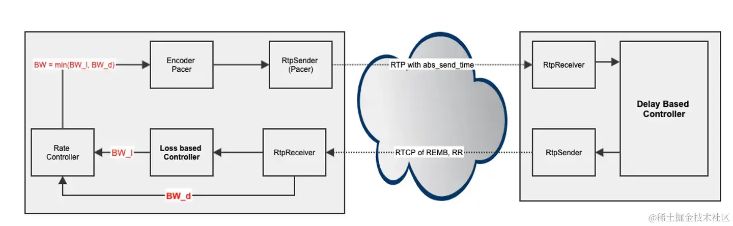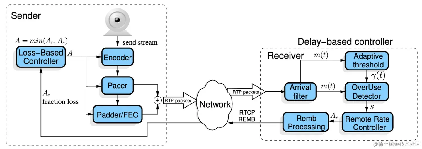 - 根据延迟估计的带宽来控制发送速率, 这个放在接收方 (WebRTC 在后续版本中也改到了发送方)