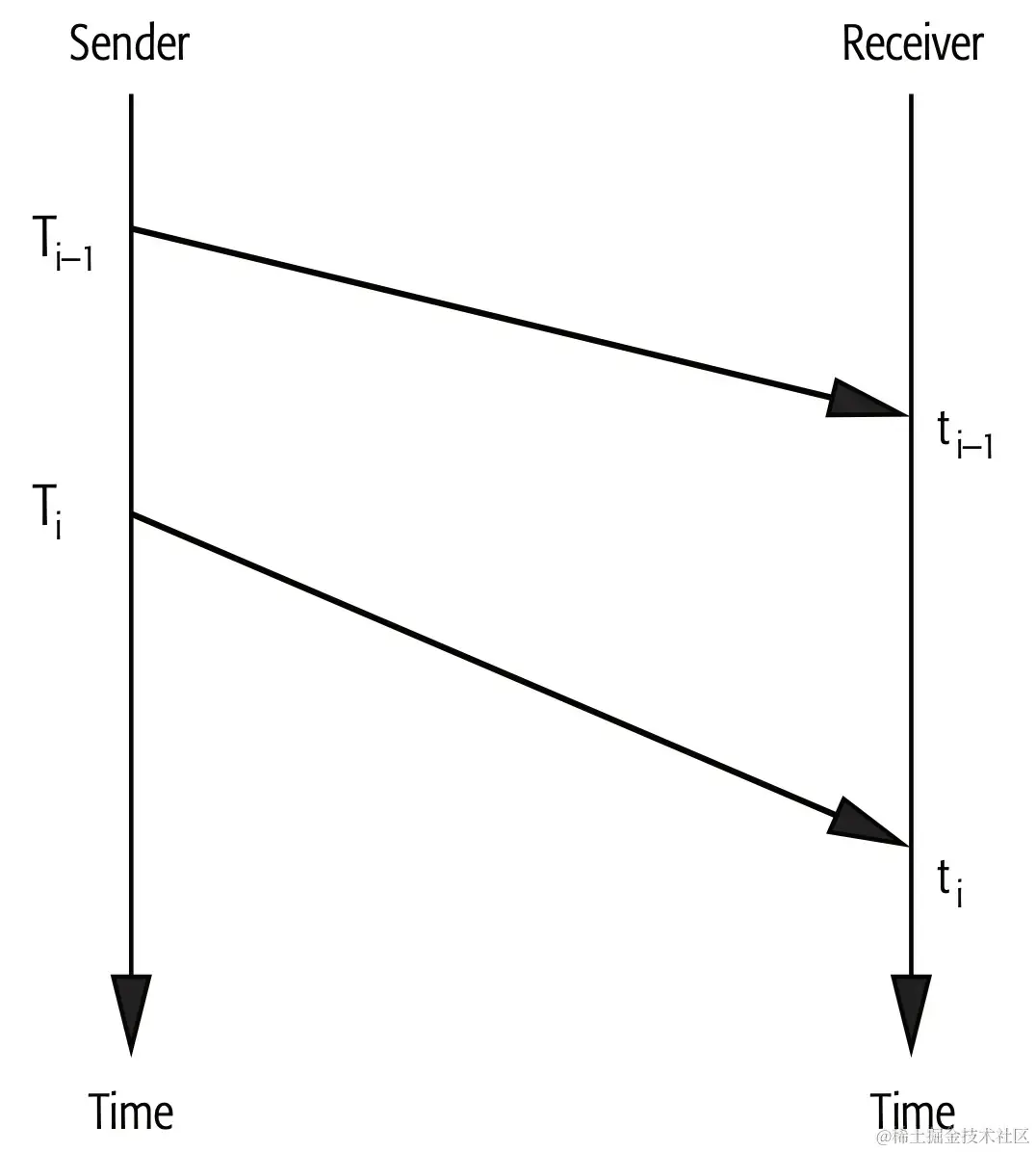 One way delay (OWD)单向延迟很简单,表示接收时间减去发送时间,如图所示,