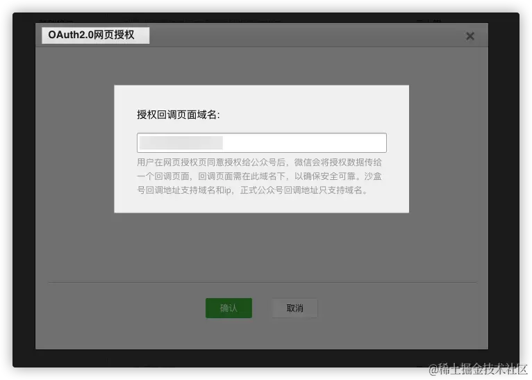 点击修改,进去网页授权域名填写,就是你希望跳转的地址的域名,这里本地调试可以填ip:port (ip:端口)这样。本地开发不用域名,当然如果你host映射重定向到一个域名(这种就是简单东西复杂化)也不是不行,就是没必要。
