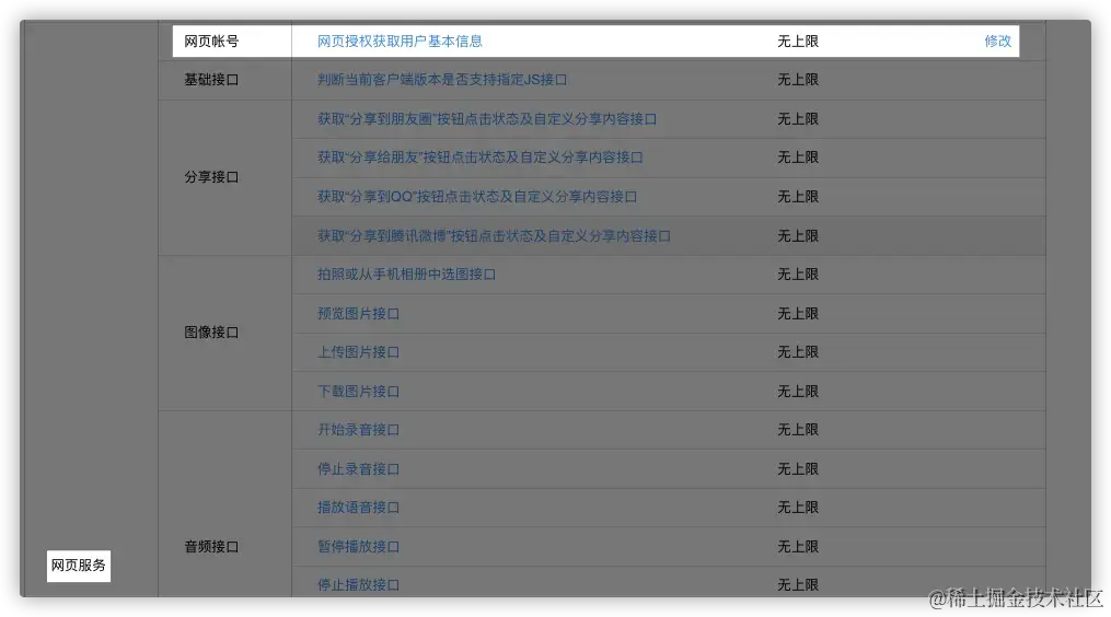 你就看到这里就行了,其他的不用管,看到网页服务-网页账号那里,去授权网页授权获取用户基本信息。