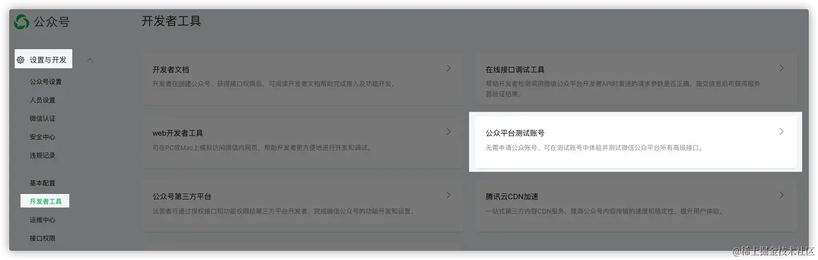 在【设置与开发】-【开发者工具】-【公众平台测试账号】,点进去。