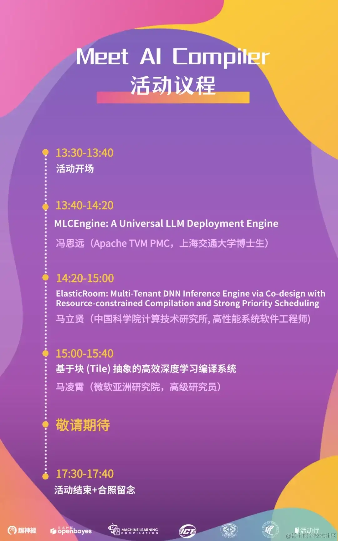 2024 年全新升级, Meet AI Compiler 整装待发,首次线下 Meetup 将于 7 月 6 日在中国科学院计算技术研究所举行。 本次 Meetup 我们有幸邀请到了来自上海交通大学、中国科学院计算技术研究所、微软亚洲研究院等多位资深 AI 编译器专家,他们将为大家带来精彩的主题分享和圆桌讨论环节,与大家共同探讨 AI 编译器技术在落地场景中的应用和突破。