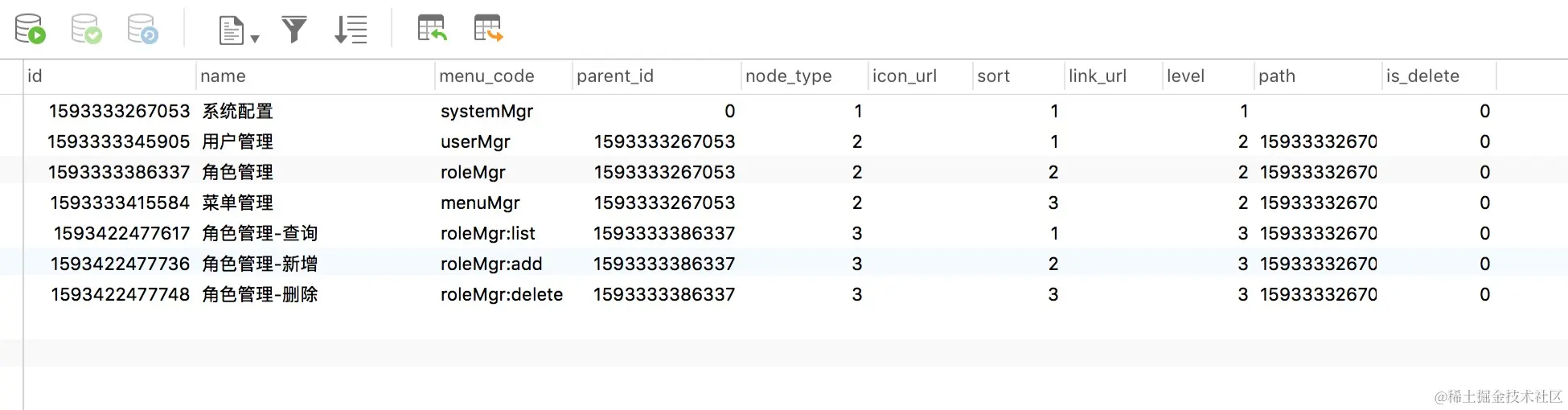 可以看到,整个菜单表就是一个父子表结构,关键字段如下: