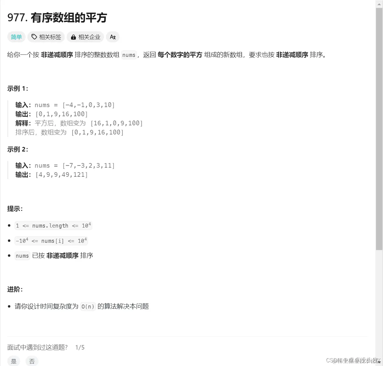 nums的长度。这是因为算法只遍历了数组一次。 - 空间复杂度:O(n),因为创建了一个与原数组长度相同的新数组。