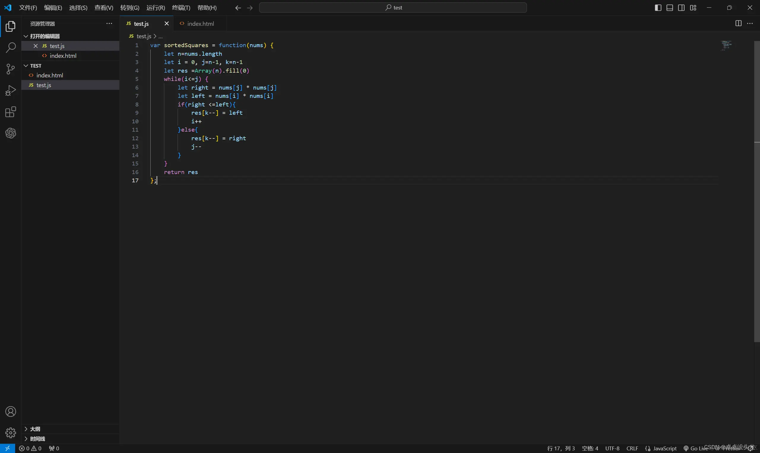 i和j分别从数组的两端开始,向中间遍历。这是解决此类问题的关键技术。 - 平方计算:对于每个指针所指向的元素,计算其平方值。这是算法中的主要操作。