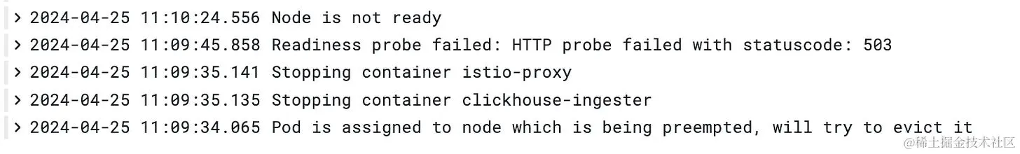 一旦此 Automation 投入使用,我们注意到一些 Spot 节点仍在没有计划的抢占事件的情况下终止。这是因为当节点问题 Detector (NPD) 查询 Azure 元数据服务以获取 VMEventSchedule 事件时,请求偶尔会失败,从而导致 NoVMEventScheduled 节点条件(如下例所示)。为了解决这个问题,我们添加了另一个自愈 Automation ,以便在抢占事件未被拦截时清理已终止的 Spot 节点。当 Spot 节点对象从 API 服务器中删除时, Detector 会创建一个 SpotNodeDeletion CR,并且修复程序会强制删除该节点上的所有 Pod 对象,假设它们不再可访问。