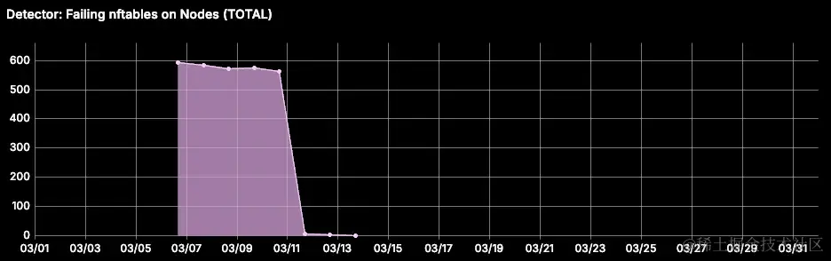 我们实施了一个自修复 Detector ,用于标记 NPD 未运行的节点。进一步的分析显示,25% 的节点存在此问题。自动终止这些节点被认为风险太大。相反,我们将所有节点上的节点操作系统回滚到以前的工作版本,并将问题上报给云提供商(请参阅问题 #3988,后来归因于已修复的上游 CVE。我们还为没有 NPD 的节点设置了自动警报,以防止未来出现问题。