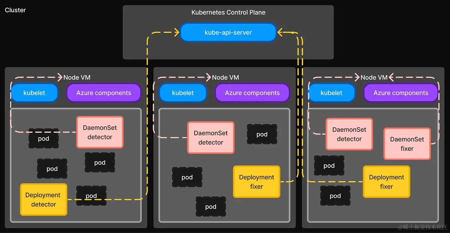 Fixer 通过执行补救步骤来纠正或清理故障状态,从而补充 Detector。与 Detector 类似,有两种类型的 Fixer - 集群级别(Deployment)和节点级别(DaemonSet)。集群级别 Fixer 执行在集群级别资源上操作的补救操作,并具有监视 API 服务器资源的权限。节点级别 Fixer 在节点级别执行补救操作,或需要特权主机访问的操作。