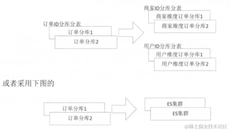 比如对于订单库,当对其分库分表后,如果想按照商家维度或者按照用户维度进行查询,那么是非常困难的,因此可以通过异构数据库来解决这个问题。可以采用下图的架构。