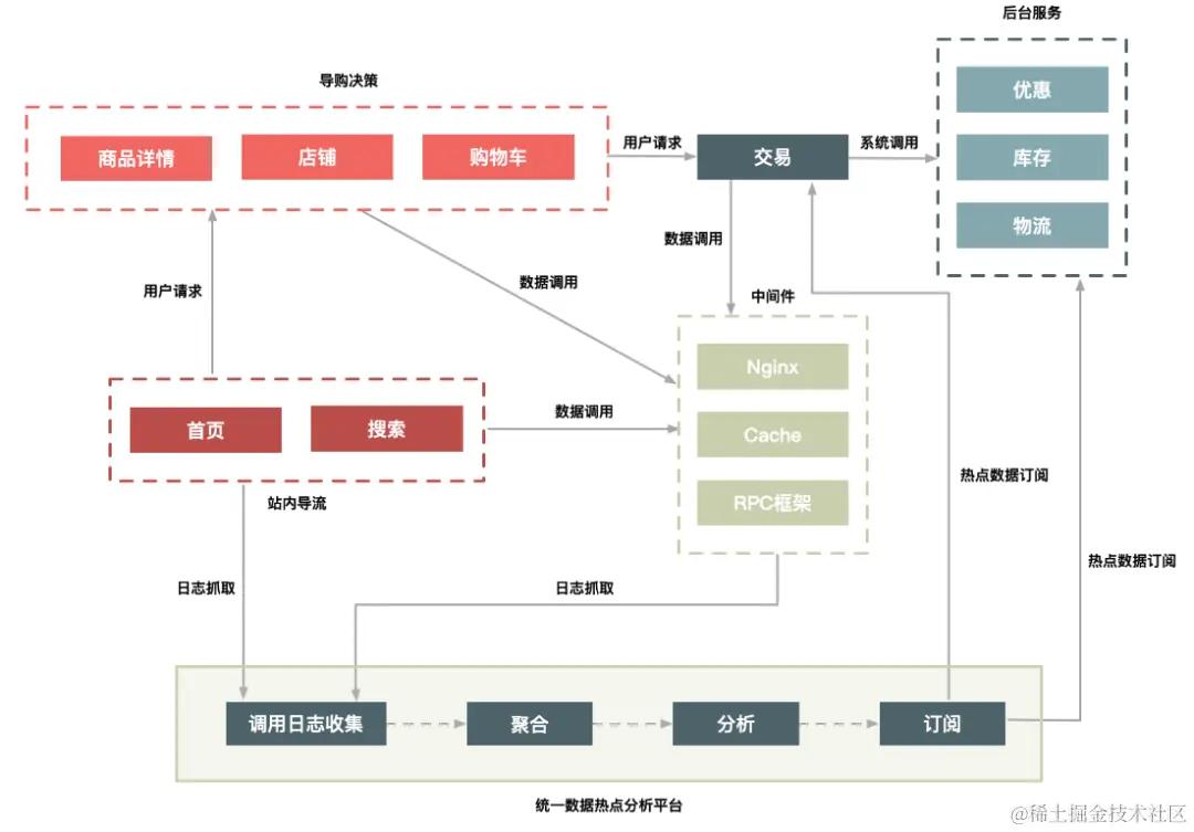这里我给出了一个图,其中用户访问商品时经过的路径有很多,我们主要是依赖前面的导购页面(包括首页、搜索页面、商品详情、购物车等)提前识别哪些商品的访问量高,通过这些系统中的中间件来收集热点数据,并记录到日志中。