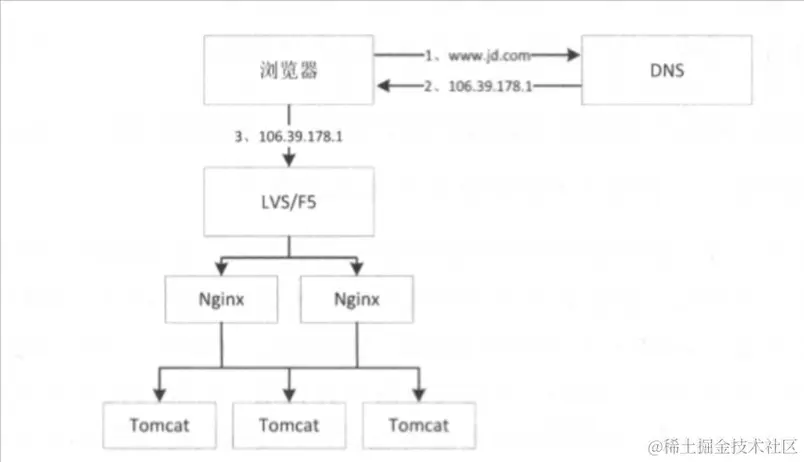 对于一般应用来说,有Nginx就可以了。但Nginx一般用于七层负载均衡,其吞吐量是有一定限制的。为了提升整体吞吐量,会在 DNS 和 Nginx之间引入接入层,如使用LVS(软件负载均衡器)、F5(硬负载均衡器)可以做四层负载均衡,即首先 DNS解析到LVS/F5,然后LVS/F5转发给Nginx,再由Nginx转发给后端Real Server。