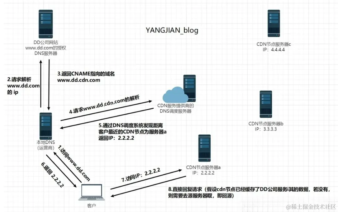 动静分离,部署时静态资源要给一个单独域名,这个域名是个CNAME,CNAME映射到CDN服务厂商提供的DNS服务器,CDN DNS服务器会根据请求的IP地址所在区域和资源内容,返回就近的CDN缓存服务器ip,后续用户对这个DNS的请求都会转到这个IP上来。