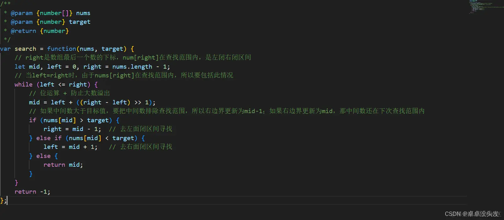 - 如果中间元素小于目标值,说明目标值位于数组的右半部分,更新low指针为mid + 1。