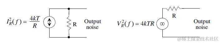 对于电阻, 其热噪声模型. 注意是I^2=4kT/R和 V^2=4kTR