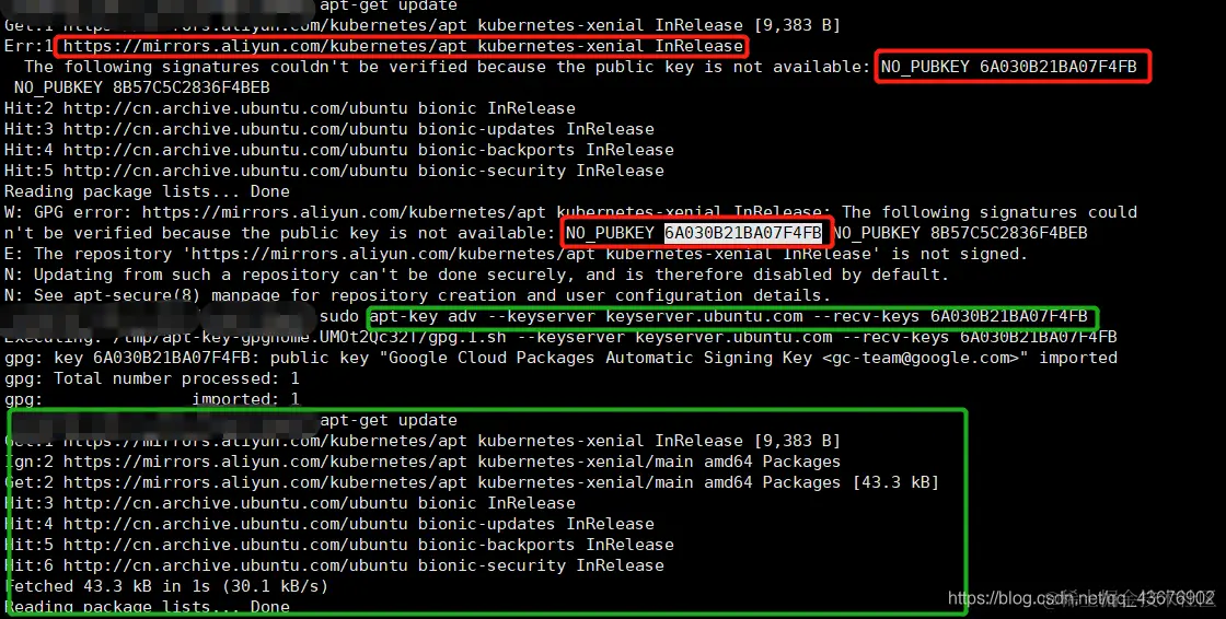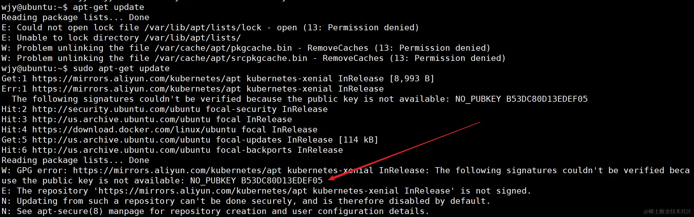 sudo apt-key adv --keyserver keyserver.ubuntu.com --recv-keys 6A030B21BA07F4FB(这个值在报错信息里) - 重新执行: