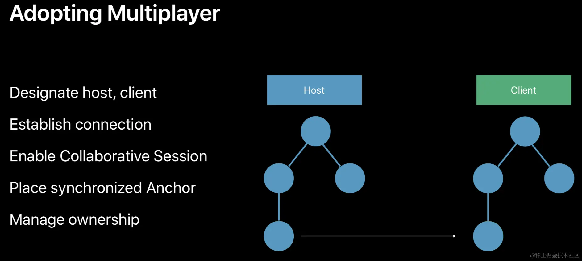 本质上,在 Host 中创建一个实体,会自动通过 ARSession 同步到 Client 中。也就是说在 Client 中有另外一个实体,但是两个设备的 ARSession 认为各自设备上的实体是同一个实体,即“同一个”物体,即存在于 Host 上,又存在于 Client 上,这就引出了所有权问题。
