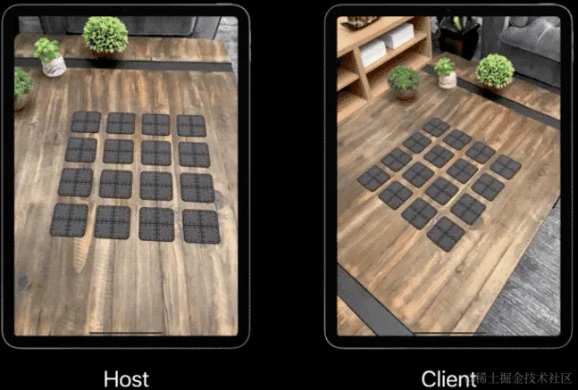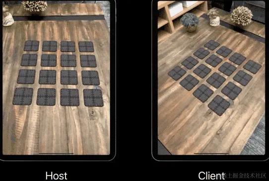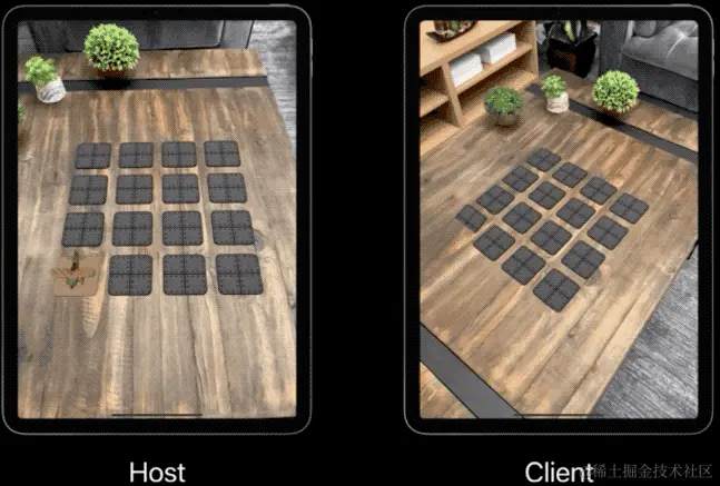 如下图所示,当所有者 Host 翻转卡片时,动画会自动同步到 Client 中。这里 RealityKit 只是发送了动画的相关数据,而不是 transfrom 中的每一帧数据,所以动画非常流畅。