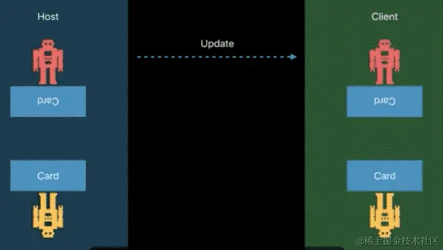 但是,当 Client 试图去翻转卡片时,却只能修改自己本地的实体,并可能在真正所有者修改后被覆盖。不能同步到网络中的其他设备上去,因为 Client 没有这个实体的所有权。