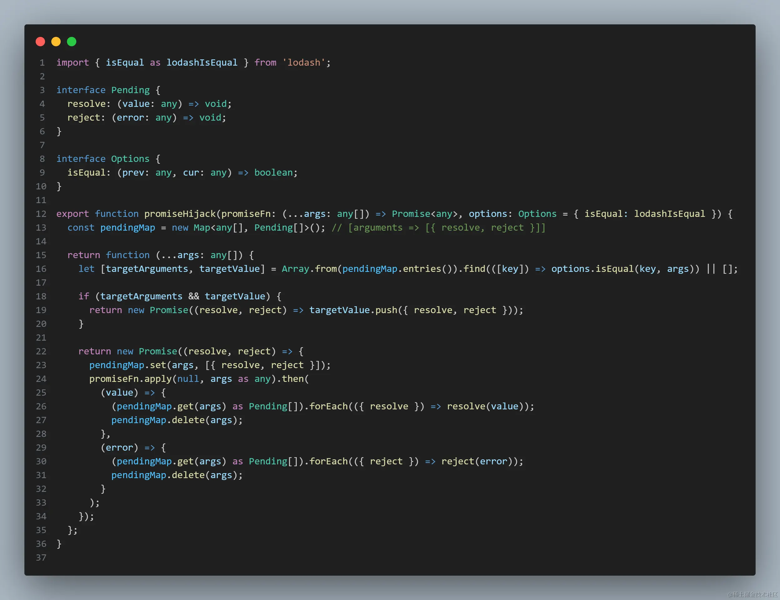 promiseHijack中使用 lodash/isEqual 来比较arguments的相同(当然你可以通过传递自定义的isEqual来改变默认的比较行为),只有arguments比较相同的promise操作才会共用同一个结果,如下: