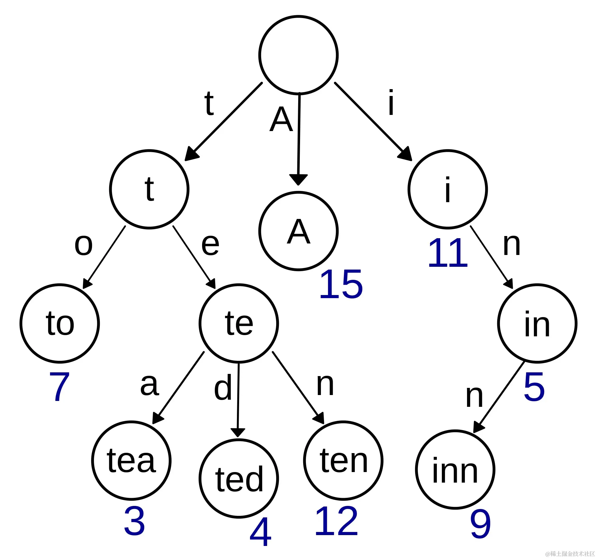 所以你看,数据结构本身是人类的思维一种建模,很多数据结构其实我们都在不知不觉中运用很多次了,既然这个叫做 压缩字典树,那必定是从不压缩字典书进化而来的,不压缩的字典树长这样: