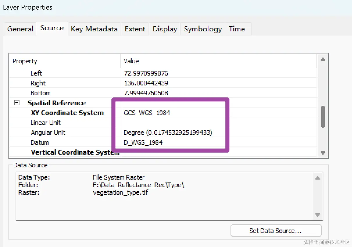 首先明确一下本文的需求。我们现在有一个.tif格式的栅格遥感影像文件,其空间坐标系为GCS_WGS_1984,也就是WGS84,是一个地理坐标系;在ArcMap软件中将其打开,可以看到其空间坐标系及空间分辨率的单位(经纬度),如下图所示。