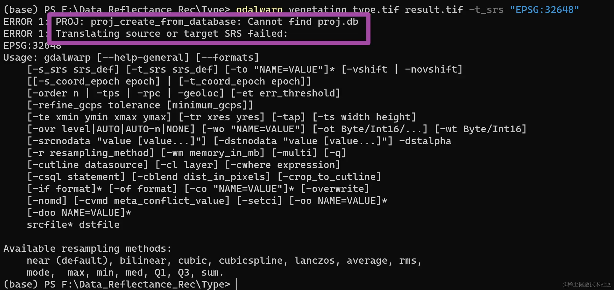 此外,需要注意的是,大家执行上述代码后,可能会出现ERROR 1: PROJ: proj_create_from_database: Cannot find proj.db这个错误提示,如下图所示。