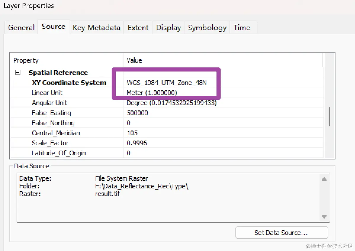 此时,如果我们用ArcGIS打开结果文件,可以看到其已经完成了投影,坐标系已经是WGS_1984_UTM_Zone_48N,且空间分辨率的单位为米;如下图所示。