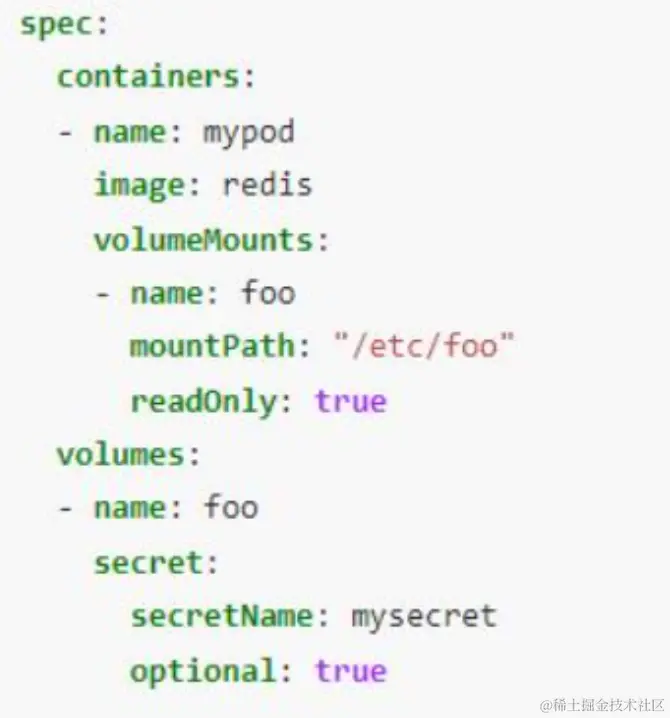 - name: secret-volume # 与volumes中定义的卷名称对应